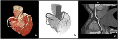 冠脉CTA图像:夹层累及右冠状动脉起始部,起始部管腔中度狭窄,狭窄程度约65%(图3a~c).