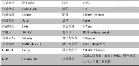 | DLP | 384mGy·cm | 扫描延迟 | 监测动脉根部,阈值100HU,曝光延迟5s行主动脉全程扫描 |