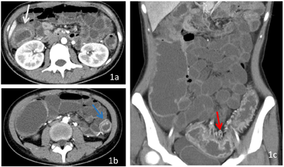 19岁女性患者,反复腹痛、粘液血便5个月,再发加重伴发热半个月。患者于5个月前无明显诱因出现腹痛、粘液血便,1~2次/d,有里急后重感,间断服用"胃肠炎药物",腹痛及便血缓解。半个月前患者受凉后上述症状再发加重,5~6次/d,伴发热,最高体温为39℃。入院时无明确病理结果。为进一步评估,进行CT小肠造影(CTE)检查。