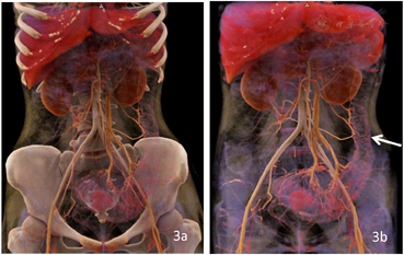 UC是一种非特异性慢性炎症性肠病,病因不明,易复发。诊断主要基于临床症状、实验室结果、内镜及组织学评估[1]。由于内镜是侵入性检查,部分患者无法忍受,且内镜检查无法观察肠外情况[2]。且对于不同分级、分期、病变部位的患者采用不同的治疗方法,准确诊断疾病对治疗及预后至关重要[3]。CTE可作为内镜检查的辅助检查手段,用于评估病变范围、分布、严重程度、病情分期、肠外情况及并发症[4]。CTE是采用双能量进行扫描,检查前患者饮用大量水,将肠腔充盈,有利于显示肠壁及腔内情况,在140kV下采集的CT图像较80KeV对比度增强,两者的融合图像对病变显示最佳(图1,图2)。同样的数据可用于进行MIP和CR后处理,不增加患者的辐射剂量,在MIP图像上,能够显示病变肠管周围的肠系膜血管,对"齿梳征"的显示更加清楚;在CR图像上能显示UC特有的"舞龙征"[5],有助于UC的诊断。骨结构可以通过syngo.CT Direct Angio去除,以清晰显示血管和病变肠管(图4b)。所有这些应用程序都是在自动化的工作流中执行的。