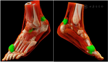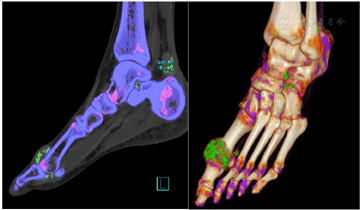 双源CT后处理图像显示左足第一跖趾关节周围及跟骨上方软组织结节,其内见多发尿酸盐结晶(绿色)沉积、跟距关节面散在少许尿酸盐结晶(图1);通过尿酸(基)图MPR及cVRT显示尿酸盐结晶的分布及与骨、关节的关系(图2);碘图清晰显示痛风石周围第一跖趾关节面、第一跖骨出现特征性的"穿凿样"骨质破坏区,边缘硬化(图3);cVRT显示第一跖趾关节痛风石与踇长伸肌腱紧密粘连,跟骨上方痛风石与跟腱紧密粘连,均未破坏或包裹邻近肌腱(图4)。患者随后手术剥离切除了第一跖趾关节及跟骨上方痛风石,并切断结扎与肌腱粘连的蒂部,病理学结果显示左足痛风结节,因跟距关节周围尿酸盐结晶散在并位于关节深部,未出现骨质破坏,选择保守治疗后复查。