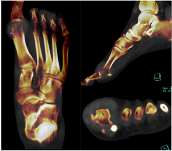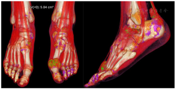 双源CT可以清晰显示骨质破坏和炎性反应过程,能更好显示肌腱与痛风石的关系,便于手术切除时保护肌腱,通过测量尿酸盐结晶的体积和分布情况,可以评价保守治疗的效果和预后。