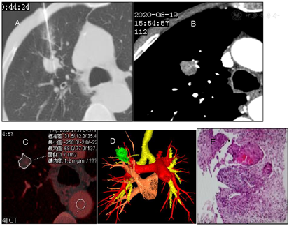 男性,70岁,咳嗽、咳痰1个月余,图ACT平扫右肺上叶前段可见1.5cm×1.7cm×2.9cm结节,边缘可见浅分叶征,上叶支气管开口处可见杯口征,平扫CT值43HU。增强扫描动脉期病灶实质部分强化,CT值62HU。静脉期65HU,延迟期68HU。图B示肿瘤内可见肿瘤微血管CT成像征。通过碘图分析及癌灶碘参数测量:动脉期IC:1.1mg/ml,NIC;0.08。图C示静脉期IC1.2mg/ml,NIC:0.26,延迟期IC0.9 mg/ml NIC0.31。静脉期碘图(0.34)诊断肺癌(腺癌)的阈值。纵膈隆突前、隆突下增大淋巴结碘图AEF值0.64~0.74,考虑淋巴结转移瘤,隆突左侧淋巴结0.58,考虑非转移性淋巴结。VR图像示:绿色结节为肿瘤,好像一只怪兽的狰狞面目。深红色为肺动脉,淡红色为肺静脉,螺旋状为支气管动脉夹杂其间。周围可见血管集束征,表面可见小结节堆积征。图D示病灶呈分叶状位于右肺上叶支气管开口处。