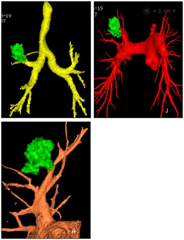 双源CT容积再现技术VR在肺癌术前模拟切除术的应用,常规螺旋CT后处理技术中MPR等也可进行三维重建,但其在肺内气管、支气管、血管、肺组织的三维重建等成像效果较差,无法精确描述结节病灶的形态及其与周围组织关系,影像诊断医师多通过冠矢位、轴位的联合观察进行诊断,但往往无法明确诊断,误诊、漏诊率均较高,且受阅片医师个人经验以及主观意识等因素的影响,最终诊断结果对临床治疗方案制定的指导作用也极为有限。而结合本组研究认为,VR后处理技术能够重建出更为真实、直观的结节病灶,对于恶性结节的实性成分、血管集束征象、分叶征、毛刺征、空泡征、胸膜凹陷征等征象的显示也为清晰,能够精确显示早期肺癌周围气管、支气管、淋巴结、血管情况,图F、J、H,并通过辨认上述组织,实现胸腔镜术前虚拟微创肿瘤切除,在保证病灶的根治切除前提下保留更多的健康肺组织,对降低手术医源性损伤、避免手术对患者呼吸功能影响过大具有重要作用,可显著提升肿瘤切除手术的术中工作效率,尤其是对于身体耐受相对较差的老年患者,通过术前的模拟切除,能够有效缩短手术时间、提高手术效率,给予早期肺癌手术切除更大的可预测性与更高的标准化手术方案[1]。从科普角度来说,患者及亲属可以在术前通过VR图像看到本人的病灶三维立体情况,使手术医师的术前谈话变得可视而且生动,使患者树立与疾病做斗争的意志和决心。