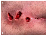 结合患者入院后相关检查及病史、体征,诊断为"骶尾部藏毛窦",治疗建议为择期行藏毛窦激光消融闭合术。患者无明显手术禁忌,在全身麻醉下行手术。手术经过:用探针自三个小凹分别沿瘘道探入,发现三个小凹均通向继发溃口处。用高频电刀将四个继发溃口周围的炎性肉芽组织切除并行部分扩创,敞开溃口,用蚊式钳及刮匙分别自三个小凹及切口探入,清理窦道的毛发及坏死组织。再将环形激光光纤分别自三小凹及切口探入至窦道顶端,自内向外边退出导管边灼烧囊壁及窦道内上皮组织。激光所用功率10W,波长1470nm,用时141.1s,能量1373.9J。修整创面,予多聚糖止血粉外敷创面,视创面无活动性出血,银离子杀菌纱布敷料压迫创面,胶布敷料外固定,术毕(图3)。详见手术视频。