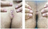 患者,男性,19岁,因"骶尾部扪及硬索1年余"入院。患者1年前无明显诱因下骶尾部出现一硬块,硬块逐渐增大,肛门组织伴疼痛不适,硬块自行溃破。入院前3周患者于我院门诊就诊,就诊时,患者骶尾部继发溃口处破溃流脓,炎症反应明显,建议炎症控制后择期手术,门诊予玉露膏外敷凉血解毒消肿,银翘解毒合剂内服辛凉解毒,后患者流脓情况较前好转,炎症范围吸收,满足手术条件,收治入院。患者平素大便通畅,每日一次,质软成形。入院时:患者神清,精神可,无畏寒发热,无自汗盗汗,无头晕头痛,无口干口渴,纳可,寐安,小便通畅,大便通畅,每日一次,质软成形,骶尾部扪及硬索明显,继发溃口处无溢脓渗液,无便血。既往史、个人史、家族史无特殊。专科检查:后正中线上S4水平见三个小凹,沿正中线向头侧方向可扪及一肿块,大小约6.0×5.0cm,上见四个继发溃口(图1)。