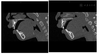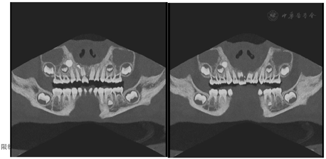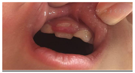 4岁男性儿童,2个月前骑车不慎摔倒致牙龈出血及嘴唇出血肿胀,后发现右侧中切牙中间断裂,由于患儿不配合检查,未行进一步治疗,近发现牙龈增大(图1),随后患儿在家长陪护下行双源CT低剂量口腔全景扫描。