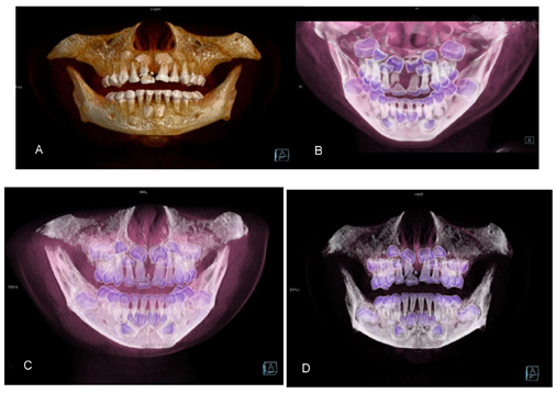 A~D CT VRT重建位 显示断裂牙齿整体状况
