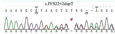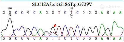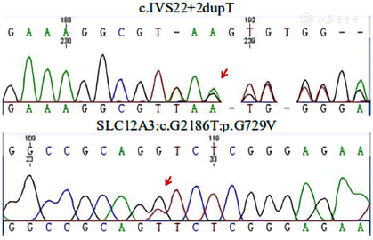 血常规、便常规未见异常,肝肾功能、心肌酶谱、血脂正常。血气分析:PH:7.44 mmHg(正常值7.35~7.45 mmHg,以下同)、二氧化碳结合力30mmHg(35~45mmHg)、乳酸1.0 mol/L(0.5~1.6 mol/L)、剩余碱:3.4 mmol/L(-3mmol/L~+3mmol/L)。多次查离子系列血钾:2.81~3.01mmol/L(3.5~5.3mmol/L),血镁0.6mmol/L(0.66~1.07mmol/L),血钠140mmol/L(137~1.47mmol/L),血氯97.5 mmol/L(99~110mmol/L),血钙2.38mmol/L(2.1~2.7) mmol/L;24小时尿量:2500ml/24h(1000~2000ml/24h),24小时尿钾:129.83mmol/24h(25~125mmol/24h),24小时尿钠:402.50mmol/24h(50~220mmol/24h),24小时尿氯:518.25mmol/24h(110~250mmol/24h),24小时尿钙:1.23mmol/24h(0~6.2mmol/24h),24小时尿镁:4.03mmol/24h(3.0~5.0mmol/24h);24小时尿肌酐:9.91mmol/24h(5.3~16mmol/24h);甲状腺功能检查:三碘甲状腺原氨酸1.10ng/ml(0.8~2ng/ml),甲状腺82.76ng/ml(51~141ng/ml),促甲状腺素1.62ng/ml(0.27~4.2ng/ml)。肾素血管紧张素醛固酮系统(RAAS):血管紧张素I(4C°)(立位):13.29 ng/ml·h;血管紧张素I(37C°)(立位):15.31ng/ml/h;血管紧张素II(立位):535.10 pg/ml(50~120pg/mL);肾素(立位)113.70 uIU/ml(4.2~45.6uIU/ml);醛固酮(卧位):266.40 pg/mL(70~300pg/ml);血管紧张素I(4C°)(卧位):3.88 ng/ml·h;血管紧张素I(37C°)(卧位):5.39ng/ml/h;血管紧张素II(卧位):421.4 pg/ml(25~60 pg/mL);肾素(卧位)32.15 uIU/ml(3.11~41.20 uIU/ml);醛固酮(卧位):76.63 pg/ml(30~160 pg/ml);促肾上腺皮质激素及皮质醇节律均正常。心电图显示:窦性心律,T波异常;心脏彩色超声:正常。甲状腺彩色超声未见异常,腹部超声、双层肾上腺平扫CT未见明显异常。患者全科住院期间予以口服补钾及静脉补钾血钾仍顽固性低钾,排除引起低钾血症的常见疾病后,最终考虑对患者进行低钾血症的基因检测。抽取患者的外周血行Gitelman综合征基因检测,同时对其父母进行亲代基因测序检验。患者及双亲基因检测:患者变异基因分别为SLC12A3,基因检测回报有2处突变,其中SLC12A3基因:外显子22 c.IVS22+2dupT,外显子18c.2186G>T突变,致病突变基因考虑为外显子18c.2186G>T,见图1。父亲突变基因为SLC12A3基因:外显子18c.2186G>T,见图2。母亲突变基因为SLC12A3基因:外显子22 c.IVS22+2dupT,见图3。由此可以推断患者通过常染色体显性遗传导致致病基因SLC12A3基因两个位点突变,结合临床考虑Gitelman综合征。