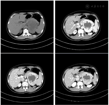 内分泌检查:去甲肾上腺素(24h) NE 20.82μg/24h,肾上腺素(24) E 3.22μg/24h,多巴胺(24h) DA 235.07μg/24h。影像学检查:超声和CT等检查提示左侧肾上腺区巨大肿物影约9.7×5.9cm,平扫中心呈稍低密度,边缘呈等密度,增强扫描动脉期边缘明显强化,静脉期及延迟期持续强化,中心可见片状无强化区,脾静脉、胰腺受压向前移位,左肾受压向后移位。