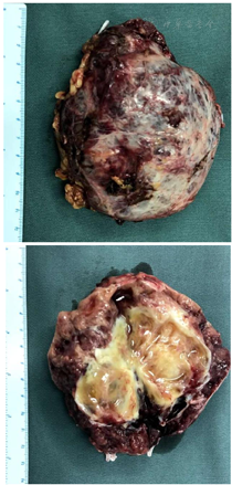 与患者充分交待病情和手术风险,患者及家属积极要求手术。遂于2019年9月2日在全麻下经腹腹腔镜左肾上腺区巨大嗜铬细胞瘤切除术,术中见左侧肾上腺区巨大肿瘤直径约10cm,包膜完整,边界尚清。手术过程顺利,完整切除左侧肾上腺区肿瘤及肾上腺及周围脂肪组织,切除肿瘤包膜完整。术中出现血量小,未输血。术中留置尿管1根、腹腔引流管1根。术后患者安返ICU病房,术后第1d拔除气管插管,清醒后安返病房,术后5天出院。