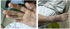 2月1日患者体温、血常规、肝功能均恢复正常,皮疹干燥,无新发皮疹,病情稳定出院。半年后随访,全身多处色素沉着,眼部后遗干涩症状,情绪稳定,未再服精神类药物。