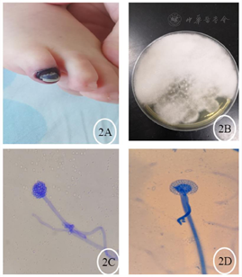 入院后给予舒普深50 mg/kg、每8小时1次和卡泊芬净首剂70 mg/m2、维持剂量50 mg/m2抗感染、他克莫司0.5 mg、每12小时1次和甲泼尼龙片6 mg、每日1次抗排异治疗,患儿体温稳定。2021年6月26日复查胸部CT提示肺炎加重,停卡泊芬净,改为伏立康唑8 mg/kg、每12小时1次抗真菌治疗。2021年7月3日患儿再次出现反复发热,以低热为主,热峰37.7~38.0℃,复查胸部CT示仍进行性加重。2021年7月7日完善纤维支气镜检查,肺泡灌洗液mNGS提示皮疽奴卡菌属,给予调整为美罗培南40 mg/kg、每8小时1次,利奈唑胺10 mg/kg、每8小时1次,继续联合伏立康唑抗感染治疗,并间断输注静注人免疫球蛋白2.5 g免疫支持治疗,患儿仍有低热。2021年7月12日PICC管培养和血mNGS回示见奴卡菌属生长,联合复方磺胺注射液0.2 g、每12小时1次联合抗感染治疗,但发热热峰呈升高趋势,38.5℃,每日1~2次,且三系出现进行性下降,给予粒细胞刺激因子升白细胞、输注悬浮红细胞和机采血小板支持治疗,并停用影响血象的药物。2021年7月17日停斯沃,加用替加环素1.2 mg/kg、每12小时1次,患儿体温热峰仍持续升高,达39.0℃,热峰2~3次/d。2021年7月23日停替加环素和美平,改为头孢他啶阿维巴坦62.5 mg/kg、每8小时1次,阿米卡星7.5 mg/kg、每12小时1次抗感染治疗,并予甲强龙改为静点控制炎症反应,停用他克莫司,患儿体温仍无好转,甲强龙逐步减量。2021年7月24日出现右侧第五脚趾指甲发黑,面积逐渐扩大至甲床、指腹(图2A)。2021年7月27日行右侧第五脚趾指甲组织培养。2021年7月29日培养结果回示小克银汉霉,给予停用威凡,加用两性霉素B脂质体3 mg/kg、每日1次,患儿每日仍有2~3次热峰,热峰稍有下降,38.0℃,应用两性霉素B脂质体后患儿出现顽固性低钾血症。2021年8月2日更换为两性霉素B胆固醇硫酸酯复合物4 mg/kg、每日1次抗真菌治疗,患儿热峰和发热间隔无好转。