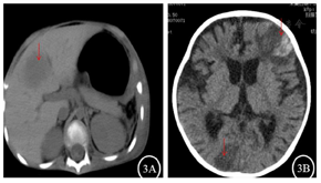 2021年8月7日患儿出现右侧手指间断抽搐、嗜睡,完善16排肝脏、头颅CT平扫示肝左叶团状低密度灶、双侧大脑半球多发团片状异常密度影、脑萎缩样改变,提示病情呈进行性进展,家属放弃治疗,随访患儿于当天死亡。