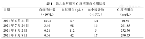 患儿,男,2岁3个月,2021年6月18日因"ALL异基因HSCT和CAR-T细胞治疗后,发热1 d"入院。2019年12月7日因"面色苍白半个月"入当地医院,经骨髓形态学、免疫分型、基因检查诊断为急性B淋巴细胞白血病(高危,MLL-AF1P阳性,CNS1)。给予VDPD方案(长春新碱+泼尼松+柔红霉素+培门冬酶)诱导缓解治疗,第33天骨髓形态学缓解,骨髓微量残留病(minimal residual disease,MRD)示异常表达细胞比值0.525%,后序贯给予CAM方案(环磷酰胺+阿糖胞苷+6-巯基嘌呤)化疗1个疗程。2020年3月14日复查骨穿,骨髓形态学示见58.2%的原始幼稚细胞,骨髓MRD示异常表达细胞比值约为44.365%,提示疾病复发,再次给予地塞米松+阿糖胞苷+柔红霉素+长春新碱方案重新诱导治疗后骨髓形态学达缓解,后序贯给予HR-1’方案(地塞米松+MTX+阿糖胞苷+培门冬酶+环磷酰胺)化疗1个疗程。