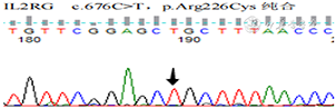 患儿入院后应用多种抗感染药物治疗效果均较差,体温不稳定,感染指标未见下降,淋巴细胞分型计数回示:T淋巴细胞0.52%,T8淋巴细胞0.26%,T4淋巴细胞0.26%,NK淋巴细胞0.69%, B淋巴细胞 93.89%,总淋巴细胞绝对计数490.34/ul,T淋巴细胞绝对计数2.53/ul,T8淋巴细胞绝对计数1.27/ul,T4淋巴细胞绝对计数1.27/ul,NK淋巴细胞绝对计数3.37/ul提示T细胞及NK细胞明显减少;胸部CT提示肺炎伴部分肺实变,两肺透光度不均匀,胸腺体积较小;心脏彩超提示卵圆孔未闭;追问家族史7年前患儿表兄生后4个月龄夭折,曾行SCID单基因突变分析检测提示IL2RG基因变异:c.676C>T,p.Arg226Cys,为纯合错义突变;对先证者行家系全外显子组测序,结果显示:IL2RG基因(NM_000206)(exon 5):c.676C>T(p.R226C)的半合子错义变异,来源于母亲;结合患儿病史、体征、淋巴细胞分型计数及基因检测结果,考虑诊断为IL2RG基因突变导致的重症联合免疫缺陷病。