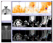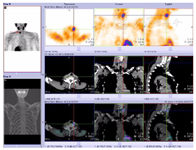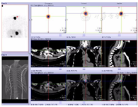 所有原发性甲状旁腺功能亢进患者中只有2%~5%的患者为MEN患者[6]。研究指出MEN患者出现的甲状旁腺病变通常累及多个腺体,通常表现为增生或腺瘤,腺体的增长是不对称及不同步的[7],故甲状旁腺的鉴别和定位至关重要。本例患者于左侧甲状腺旁腺区发现2个病灶,图像特征相似,故首先考虑均为甲状旁腺来源病灶。但甲状旁腺融合呈像时,ECT仅发现上方病灶有异常示踪剂浓集,而下方病灶没有示踪剂浓集,但行131I-MIBG治疗时,却发现下方病灶有大量摄取,故考虑下方病灶为副神经节瘤。