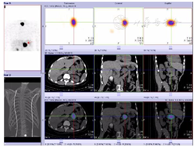 入院后行甲状腺超声示甲状腺左叶上、下极深方甲状旁腺区见2个囊实性结节,大小分别为2.9cm×1.4cm×1.1cm、2.3cm×1.4cm×1.2cm,均形态规则,边界清晰,CDFI:内见较丰富血流信号(图1,图2,图3,图4)。行甲状旁腺融合显像(显像剂:99Tcm-MIBI)示甲状腺左叶上极后上方见结节样显像剂浓聚灶,相应CT层面示椭圆形软组织密度影,边界清,大小约27.6mm×18.2mm×16.0mm。CT另见甲状腺左叶下极后下方一椭圆形软组织密度影,边界较清,大小约25mm×13.7mm×12.5mm,相应ECT层面未见显像剂摄取(图5,图6)。行嗜铬细胞瘤融合成像(显像剂:131I-MIBG)示颈部及腹部可见显像剂摄取病灶(图7,图8)。