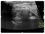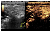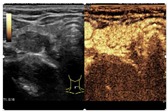 充分告知患者及家属治疗目的、手段及可能出现的并发症后患者签署知情同意书,完成凝血功能化验、心电图、喉镜等数前评估。术前禁食4h,建立静脉通道,术前sonovue超声造影(CEUS)示甲状腺旁腺腺瘤结节与甲状腺实质同步增强,呈不均匀等增强(图9,视频1)。患者呈仰卧位,充分暴露颈部,常规消毒铺巾,消融后1%利多卡因局部麻醉,甲状旁腺结节后缘注射5~10ml生理盐水形成隔离带(视频2、3),以保护周围血管、气管、食管、喉返神经等正常组织。将16G微波消融针置于病变中央,输出功率为30W,消融后气泡样强回声较多时及时更换位置,直至强回声完全覆盖病灶时停止操作,共计1分20秒(图10,视频4、5)。消融后行CEUS评估,评估甲状旁腺病灶内未见造影剂进入(图11,视频6)。消融结束后,消融区域压迫30分钟,并观察2h。术中及术后观察均未发现出血、声音嘶哑等并发症。