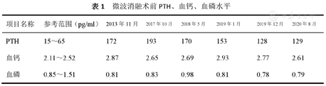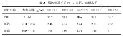 热消融作为一种重要的微创技术,其出现扩大了非手术治疗的选择范围。热消融的基本原理是利用热能诱发甲状旁腺细胞凝固坏死,降低血清PTH和血清钙水平。热消融与传统的外科手术相比具有创伤小、并发症少、住院时间短、重复操作性强等优势[4]。MWA属于热消融的范畴,微波通过电极裸露的针尖接触病变的组织,使靶组织在高温下凝固变性,在肿瘤和继发性甲旁亢的治疗中已有应用,但是用于治疗pHPT的经验国内外还十分有限[5] ,关于微波消融治疗MEN相关原发性甲旁亢更是鲜有报道。本例患者通过微波消融治疗后,甲状旁腺激素、血钙及血磷水平均迅速恢复正常,骨痛症状也迅速得到缓解,随访中患者未出现任何不良并发症。因此对于拒绝手术或存在外科手术禁忌的pHPT患者微波消融可作为备选方案,此病例的成功为MVA治疗MEN相关甲状旁腺亢进提供了宝贵经验。