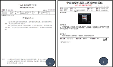足部正斜位片提示:1.右足第5跖骨部分骨质破坏,软组织明显肿胀、积气,考虑骨髓炎可能;2.右足第2-4近段跖骨边缘轻度骨膜增生,考虑慢性骨膜炎可能;下肢彩超示:双侧下肢动脉硬化性病变并多发小硬斑形成,管腔未见明显狭窄。检查结果见图1。