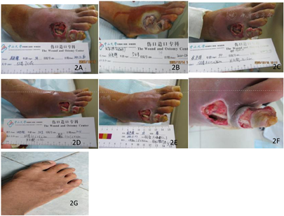 2020年12月14日首次接诊该患者,采用生理盐水清洗伤口,局部保守锐性清创清除部分坏死组织,磺胺嘧啶银脂质水胶体敷料引流以及保护外露肌腱,加亲水性纤维含银敷料控制感染、管理渗液,换药频率1次/d。12月16日伤口评估右足背伤口大小5 cm×3.5 cm×1.3 cm,足趾伤口大小3 cm×2.8 cm×0.3 cm,基底组织均为50%黄色,50%黄色,渗液量均潮湿,气味3级,疼痛(VAS)3分,周围皮肤红肿减轻,无浸渍,伤口处理予保守锐性清创+超声清创的方法,敷料继续予磺胺嘧啶银脂质水胶体敷料引流,加亲水性纤维含银敷料控制感染。住院第8天(2020年12月22日),右足背伤口缩小为4 cm×3.5 cm×1.3 cm,足趾伤口大小为3 cm×2.8 cm×0.3 cm,肉芽组织生长,右足背与足趾伤口皮下已不相通,两处伤口基底组织均75%红色,25%黄色,渗液量与敷料关系分别为潮湿和湿润,气味4级;伤口处理方案同前。住院第10天(2020年12月24日),两处伤口大小分别缩小至3.5 cm×2.5 cm×1.2 cm和3.0 cm×2.5 cm×0.3 cm,伤口表面黄白色膜状物覆盖,其余情况同前。继续采用保守锐性清创结合超声清创方法,促进生物膜破坏和清除,有效清除失活软组织,敷料选择同前。住院第11天(2020年12月25日),两处伤口继续缩小,基底组织转为100%红色,右足背伤口环状潜行缩小至0.8 cm~2.8 cm,足背疼痛得到明显缓解,无臭味,VAS评分1分,周围皮肤红肿均较前明显改善,其余评估同前。敷料选择同前,继续控制感染、保护肌腱、促进肉芽生长。患者白细胞、血红蛋白、白蛋白、血糖等实验室检查恢复正常,复查细菌培养结果无细菌生长,X光片未提示骨髓炎,此次处理后患者出院,予带敷料出院回当地医院门诊继续治疗。
