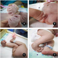 入院查体:足月儿外貌,精神反应差,自主活动少。全身皮肤雪白,弹性可。舌后坠,呼吸节律不规整,双肺呼吸音粗,吸气相延长,可未闻及明显痰鸣音。心音有力,心率齐,各瓣膜区未闻及明显杂音。腹平,肠鸣音正常。双侧阴囊小,皱褶少,睾丸未降至阴囊,阴茎细小。四肢曲屈位,关节挛缩,肌张力高,双手食指倾斜、弯曲。右手通贯掌,右足内翻。觅食、吸吮、握持及拥抱反射未引出。