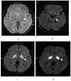 注:a为2a前头颅MRI影像,示双侧苍白球对称性FLAIR序列高信号;b-d为本次就诊时头颅MRI影像,b显示双侧大脑脚对称性FLAIR序列高信号,c-d显示双侧基底节区豆状核对称性FLAIR和DWI序列高信号。