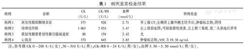 | 病例 | 诊断 | CK(U/L) | CK-MB(U/L) | 血钾(mmol/L) | 特殊检查 |