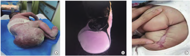 女,孕期彩超排畸检查发现骶尾部肿物,随胎儿发育增大,胎龄38+2周剖宫产,体重3. 4 kg,胎盘、羊水、脐带均正常。查体:发育、营养好,心肺腹无殊。肢体肌张力正常,新生儿反射存在。骶尾部可见一肿物蔓延至整个臀部(图1A) ,大小约15 cm × 6 cm,高于周边组织。辅助检查:动脉血气分析、肝肾功能、甲状腺功能、血糖、电解质、血常规、凝血常规等在正常范围,遗传代谢病筛查无异常。MRI平扫+增强:骶尾部巨大囊实性占位,考虑畸胎瘤(图1B)。入院后住多功能婴儿暖箱,箱温保持30~ 33 ℃。禁食插胃管,吸氧,输液纠正水电解质紊乱和酸中毒,控制感染等,评估可耐受手术后予以完整切除肿瘤,采用骶部常规手术切口倒"V"形,尖顶超过尾骨,左右两侧向双臀延伸,切口暴露广,距离肛门较远,术后恢复良好。病理诊断:符合成熟型畸胎瘤(图2) ,局部皮肤溃烂结痂形成。术后给予保暖,营养支持,控制感染和皮肤护理,疼痛管理等治疗,复查AFP正常。随访1年,生长发育评估正常,畸胎瘤无复发(图1C)。