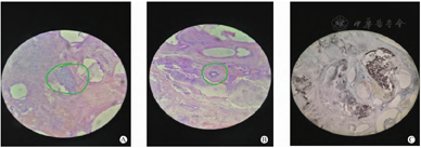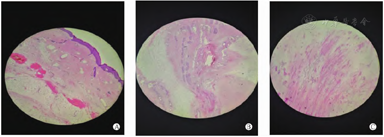 男,胎龄34+3周,孕晚期彩超排畸检查发现口腔内肿物,因胎盘早剥、宫内窘迫,剖宫产,出生体重2. 4 kg。由外院转入,出生后极度呼吸困难,给予气管插管辅助呼吸。查体:口腔内肿物约4. 1 cm× 3. 9 cm,阻塞气道(图3A) ,颈软,三凹征阳性,双肺可闻及干湿性啰音。心腹无特殊,肢体肌张力正常,新生儿原始反射存在。辅助检查: AFP显著增高,遗传代谢病筛查无异常。动脉血气分析、血糖、电解质、肝功能、血常规、凝血常规等在正常范围。MRI平扫+增强:口咽部囊实性占位,横截面39 mm×41 mm,考虑畸胎瘤(图3B)。病情稳定后手术切除,采用全麻下咽部肿瘤切除+任意皮瓣成形+腭咽成形术顺利切除(图3C)。术后病理:未成熟型畸胎瘤Ⅱ级,灶性伴钙化、间质黏液变(图4)。术后复查AFP仍有增高,住院10 d好转出院。2个月随访,MRI平扫加增强提示左侧咽旁间隙实性占位,考虑复发,3个月时再次手术扩大了切除范围,术后病理为未成熟型畸胎瘤Ⅲ级。1岁时随访,体重10 kg,生长发育评估正常,未进行化疗(图3C)。