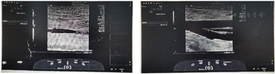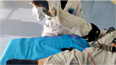 血流限制性训练及低频脉冲电治疗方法及处方如下:将充气袖带绑扎于患者大腿根部充气加压,利用超声观察患者足背动脉血流信号,待患者足背动脉血流信号完全消失时,记录袖带气压值,取此压力值的50%作为每次血流限制训练的压力值(图5),该患者为80 mmHg(1 mmHg=0.133 kPa)。低频脉冲电治疗贴片贴于患者大腿根部股神经与腓骨头腓总神经处,对患者股神经与腓总神经进行刺激(图6)。1次/d,每次20~30 min,每周治疗5次。根据患者肌肉厚度、肌力及平衡与步行能力对患者治疗效果进行评估。