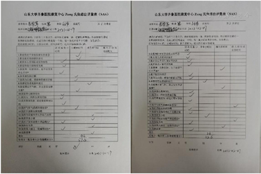 康复治疗:给予截瘫肢体综合训练、平衡功能训练、关节松动训练、手功能训练、气压治疗、有氧训练等,预防肌肉萎缩、关节挛缩等并发症;给予针灸、中频脉冲电治疗、低频脉冲电治疗、电子生物反馈、盆底磁刺激等,以改善循环、加强肌肉收缩运动,促进肢体功能恢复和二便功能恢复。患者轻度焦虑状态(图1),给予患者心理干预,改善患者焦虑状态,辅助增加康复治疗效果。