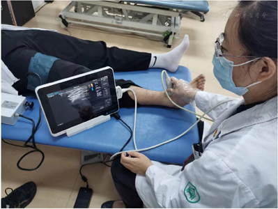 实验证明,血流限制性训练可以通过较小的运动强度产生与大强度力量训练相似的训练效果[22],将血流限制与低强度运动相结合可以产生有益的肌肉适应,并在提高肌肉质量和力量、提高有氧能力、促进康复治疗和预防废用性肌萎缩方面有良好的效果[18]。相关研究表明,血流限制性训练即使在低至20% 1RM的运动强度下也显示出有益的训练效果[23],而持续规范血流限制训练,可增加肌肉代谢,刺激生长激素分泌,强度保持在20%的最大自主收缩,维持稳定离心收缩和向心收缩2 s的速度,运动至力竭[24]。血流限制在机械运动后,可诱导肌肉神经组织的生长与代谢,增加骨骼肌的机械负荷和肌肉质量,患者在训练前期可出现不适应感觉,但随着肢体功能的恢复,可逐渐适应训练强度[25,26]。Natsume等[21]研究发现,神经肌肉电刺激与血流限制相结合时,可诱导肌肉肥厚,并伴随肌肉力量的增加。本病历中患者早期康复治疗效果欠佳,此后通过利用超声观察患者足背动脉血流信号,确定每次血流限制训练的个性化压力值,实施手法治疗结合血流限制及低频脉冲电治疗的综合治疗,患者的肌肉厚度、肌力及步行能力等均有明显改善。