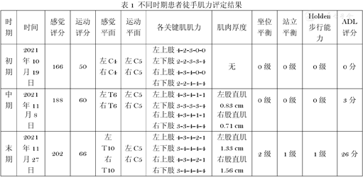 随访及转归:整体治疗效果为好转,入院时Zung氏焦虑自评量表评分为:57.5(标准分),患者为轻度焦虑状态,经治疗后Zung氏焦虑自评量表评分为:32.5(标准分),患者无焦虑状态,徒手肌力评定(表1):肌力由左上肢4-2-3-0-0、左下肢2-2-3-3-4、右上肢4-3-4-0-0、右下肢2-2-4-4-4,改善至左上肢4-3-4-2-1、左下肢3-4-4-4-4、右上肢4-3-4-2-1、右下肢3-4-4-4-4;双侧C5-T10感觉功能恢复;坐位平衡0→2级,出院时患者站立平衡为1级,Holden步行能力分级1级,ADL:由0分→26分,最终回归家庭。