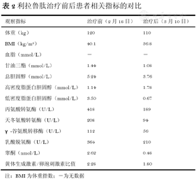 患者无不适反应,血糖控制明显改善,进食量减少,体重下降,月经恢复正常周期,肝功能和血脂均明显改善。
