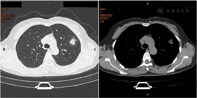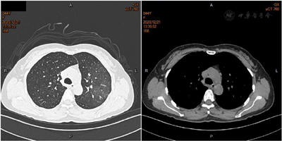 患者,女性,44岁,主因"反复发热6 d"于2020年12月11日入院。患者于6 d前受凉后出现发热,体温最高39.2℃,热型无规律,无畏寒,无寒战,无汗,无咳嗽,无咽痛,无鼻塞、流涕,无味觉、嗅觉减退,无结膜炎,无肌肉酸痛,无乏力,无腹泻,无皮疹。自服退热药(具体药物不详)后体温退至正常,转日体温再次升高,2020年12月7日就诊于我院发热门诊,查血常规+CRP:WBC 6.6×109/L,Neu% 78.2%,Lym% 14.3%,CRP 17.7 mg/L,新冠病毒核酸检测、新冠病毒抗体(IgG+IgM)阴性,胸部CT平扫考虑左肺上叶感染(图1),予头孢克肟口服治疗,仍反复发热。2020年12月11日再次就诊于我院发热门诊,查血常规+CRP:WBC 4.19×109/L,Neu% 73.1%,Lym% 19.3%,CRP 87.7 mg/L,胸部CT平扫:左肺上叶片状磨玻璃状阴影,较前明显增大,考虑炎性病变(图2),以"肺部感染"收入院。刻下症:发热,热型无规律,纳差,眠可,二便调。既往体健,否认慢性病史。末次月经2020年12月3日。