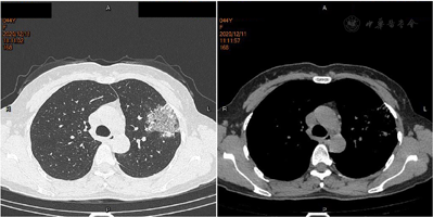 患者,女性,44岁,主因"发热6 d"入院。患者6 d前受凉后出现发热,体温最高39.2℃,热型无规律,自服退热药(具体药物不详)后体温退至正常。转日体温再次升高,胸部CT考虑左肺上叶感染,予头孢克肟口服治疗后仍反复发热。4 d后复查胸部CT病灶较前明显增大。入院后予头孢他啶静点抗感染治疗,仍持续高热且出现干咳,体温最高40.2℃,感染指标升高。既往体健,否认慢性病史。