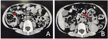 辅助检查:入院查血常规,白细胞计数14.84×109/L,血红蛋白86 g/L,血小板计数396×109/L,中性粒细胞百分比57.2%,淋巴细胞百分比31.1%;C反应蛋白166.68 mg/L,红细胞沉降率53 mm/h,降钙素原4.07 ng/ml,血尿便细菌培养、血生化、凝血功能、血尿便培养均阴性,脑脊液化验、EB病毒、巨细胞病毒检测、骨髓涂片及培养、风湿因子、自身抗体谱、结核菌素T细胞检测均为阴性,腹部彩超无明显异常。全腹部CT:1.右下腹网膜增厚,邻近肠管扩张;2.中下腹肠系膜淋巴结明显增多,部分肿大,部分沿肠系膜上动脉周围分布走行(图2)。