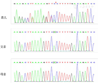 基因检测:同家长沟通后治疗上给予沙利度胺口服,3周后因出现肢体麻木、震颤等副作用停止使用。同时基因重排结果回示排除淋巴瘤。进一步沟通并签署知情同意书后,取患儿及其父母的新鲜全血2 ml,利用家系全外显子测序分析,发现患儿存在TNFAIP3基因杂合变异(NM_001270508:c.866delA),为移码突变。该变异位点经Sanger测序验证(图3),可见患儿TNFAIP3基因杂合变异(c.866delA),而其父母均为野生型,为自发突变。HGMD及Clinvar数据库均无该变异位点的相关报道和致病性分析。根据美国医学遗传学和基因组学学会指南,该变异判定为致病性变异,证据为致病性证据超强PVS1(LOF变异导致基因功能可能丧失)、致病性证据中等PM2(在正常人群数据库中的频率为低频变异)、致病性证据中等PM6(假定新发变异)。
