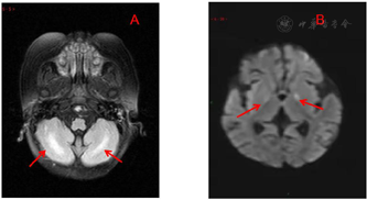 患儿既往生长发育正常,发病前1周添加配方奶粉,本次病程中出现低血糖、严重酸中毒、低血压表现。头颅MRI:双侧小脑半球、双侧基底节区见斑片状及小斑片状对称分布异常信号影,边缘不清,呈T1W1低信号、T2W1及黑水序列呈高信号。