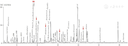 血尿遗传代谢筛查:血遗传代谢病筛查示,乙酰肉碱升高,余未见显著异常。尿气相色谱质谱显示,多种有机酸(3-羟基丙酸、3-羟基异戊酸、甘油酸、己二酸、辛二酸、3-羟基丁酸、3-羟基-4-己烯酸、5-羟基己酸、顺式-5-羟基-2-己烯酸、反式-3-羟基-4-己烯酸)增高(图2)。