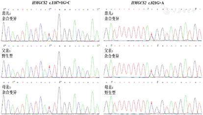 基因检测:患儿HMGCS2基因(NM_005518)存在2个杂合变异,分别为4号外显子c.821G>A(p.R274H)杂合变异和6号内含子c.1187+1G>C杂合变异。采用PCR-Sanger测序方法进行家系验证,证实这两个变异分别遗传自父亲和母亲,为复合杂合变异(图3)。