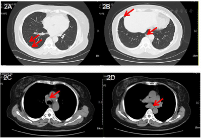 专科检查:面部及全身未见皮疹,浅表淋巴结未扪及肿大。心肺腹查体未见异常,各关节无压痛及肿胀,双下肢不肿。辅助检查:血、尿、便常规、肝功能、肾功能未见明显异常;红细胞沉降率(ESR)12 mm/h,C-反应蛋白1.67 mg/L;肿瘤标记物、干扰素刺激淋巴细胞增殖试验(T-spot)未见明显异常;抗核抗体(ANA)阳性(1:320),抗ENA抗体谱、ANCA阴性;免疫球蛋白(immunoglobin,Ig)G 10.90g/L,IgA 2.54g/L,IgM 1.58g/L,补体C3 0.84 g/L,补体C4 0.19 g/L;胸部CT:双肺可见多个结节(图2A、B);纵隔内多发增大淋巴结,部分融合,较大者位于气管隆突下(图2C、D)。眼部检查:双眼角膜色素性沉着(keratic precipitate,KP)(++)。