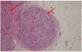 患者胸部CT表现疑诊结节病,追问患者病史、详细查体后,发现左肘伸侧及右侧臀部有皮肤结节,行皮肤结节活检,病理提示"真皮内可见多个大小不一的上皮样裸结节(图3)",查血清血管紧张素转化酶水平升高(78.8 U/L)。