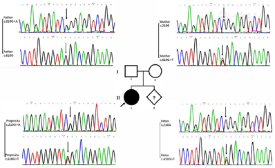 先证者临床初步诊断为眼皮肤白化病患儿,患儿夫妇再次怀孕,寻求病因及产前诊断。