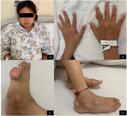 娃娃脸,身材矮小,贫血貌,双手、双足多发痛风石形成。