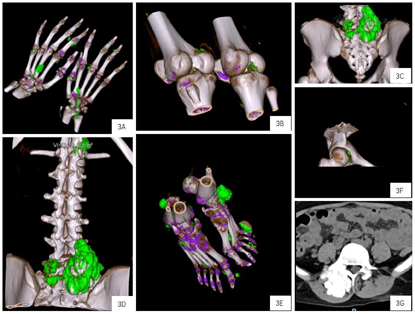 生化提示高尿酸、低血糖、酸中毒、高脂血症、肝肾功能损害,双源CT提示多发痛风石形成,基因检查提示糖原贮积病Ⅰa型。
