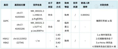 因患者少年起病,14年前已发现有肝脾大,没有不良饮食嗜好却存在严重高尿酸血症,多处痛风石形成,且追问病史,既往有多次空腹时头晕、心悸、手抖症状,2019年9月在我院住院期间查空腹血糖2.83 mmol/L,二氧化碳结合力20.1 mmol/L,酮体水平正常。根据低血糖查因的诊断及鉴别诊断,结合患者有娃娃脸、高脂血症、转氨酶升高,考虑诊断为GSDⅠ型可能性大,行GSD相关基因检测(二代高通量测序),检测结果回报为GSDⅠa型(图4)。该患者最终诊断:1.GSDⅠa型,继发性痛风,高甘油三酯血症,肝功能不全,慢性肾脏病2期;2.α型地中海贫血,脾切除术后,继发性血小板增多症。