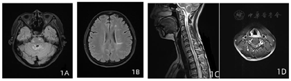 辅助检查:血尿粪常规、凝血系列、血生化全套、电解质、糖化血红蛋白、叶酸、维生素B12、肿瘤标志物、甲状腺功能、风湿因子、自身抗体初筛等未见明显异常。脑脊液寡克隆区带阳性(2型)。血、脑脊液AQP4抗体阴性。颅脑、颈胸椎MRI(平扫+增强):幕上及幕下脑白质内多发炎性脱髓鞘病灶;C4-6椎体水平颈髓斑片状强化、脑桥及延髓内异常信号影,小脑内异常强化。